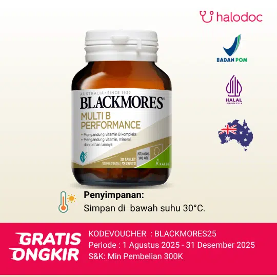 Blackmores Multi B Performance 30 tablet adalah suplemen kesehatan yang mengandung kombinasi vitamin B kompleks (B1, B2, B3, B5, B6, B12) dan vitamin C.