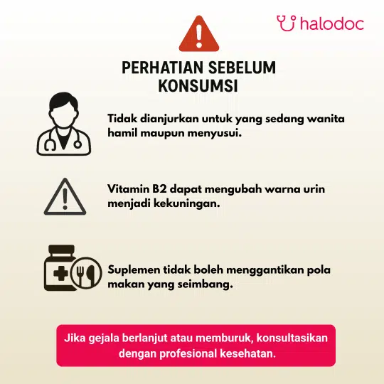 Efek samping yang paling umum adalah air seni (urin) akan berubah warna menjadi kuning cerah, yang merupakan hal normal dan tidak berbahaya karena tubuh membuang kelebihan Vitamin B2 (Riboflavin). Dapat juga terjadi mual ringan jika dikonsumsi saat perut kosong.