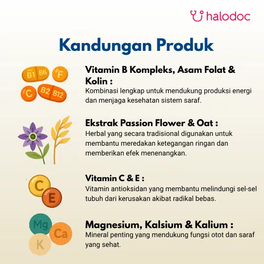 Vitamin B1 67 mg, Vitamin B2 10 mg, Nicotinamide 100 mg, Vitamin B5 69 mg, Vitamin B6 21 mg, Vitamin B12 30 mcg, Vitamin H 20 mcg, Asam askorbat 250 mg, Vitamin E 50 IU (34 mg), Magnesium 29 mg, Kalsium 37 mg, Kalium 34 mg, Asam folat 150 mcg, Ekstrak Avena sativa (oats) setara dengan biji kering 250 mg, Ekstrak Passiflora incarnata (passion flower) 100 mg, Lecitin 50 mg, Kolin bitartrat 25 mg, Inositol 25 mg.