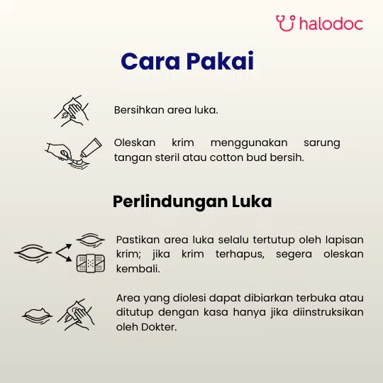 Setelah membersihkan & debridement luka, oleskan krim dengan sarung tangan steril pada permukaan yg terbakar, 1-2 x sehari dengan ketebalan 2 mm. Terapi dilanjutkan s/d penyembuhan atau sisi yg terbakar sudah siap untuk dicangkok.