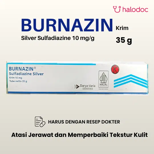 BURNAZIN CREAM adalah obat yang mengandung Silver Sulfadiazine. Obat ini digunakan untuk mengobati atau mencegah infeksi pada luka bakar yang rentan terhadap infeksi sekunder. Dalam penggunaan obat ini harus SESUAI DENGAN PETUNJUK DOKTER.