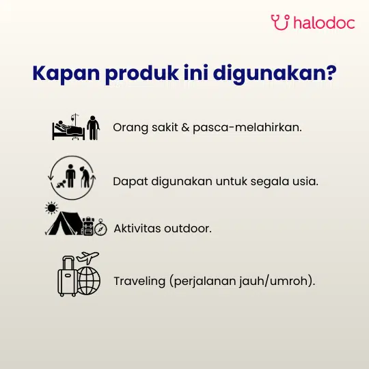Keunggulan: Praktis digunakan untuk pasien yang sedang tirah baring (bedrest), pengguna kursi roda, setelah operasi, atau saat kondisi air terbatas (travelling/camping).