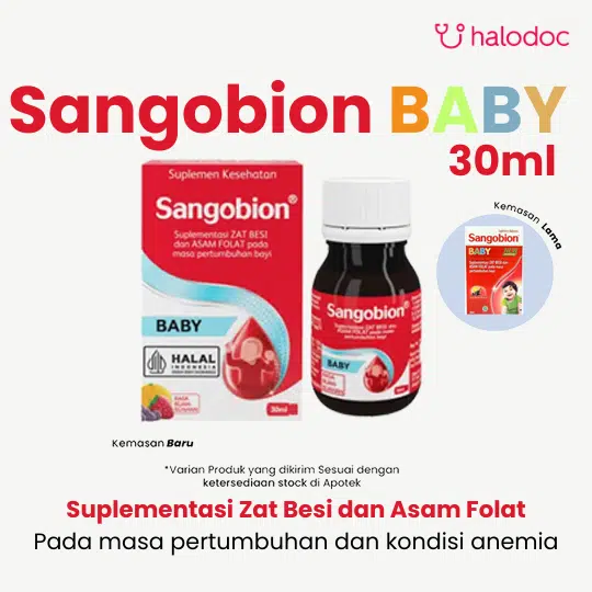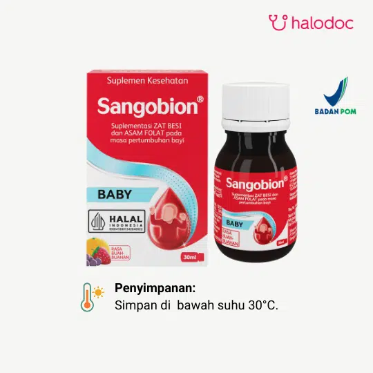 Sangobion Baby 30 ml adalah suplemen kesehatan dalam bentuk tetes (drop) untuk bayi, bertujuan untuk membantu memenuhi kebutuhan zat besi dan vitamin untuk keadaan anemia karena kekurangan zat besi.