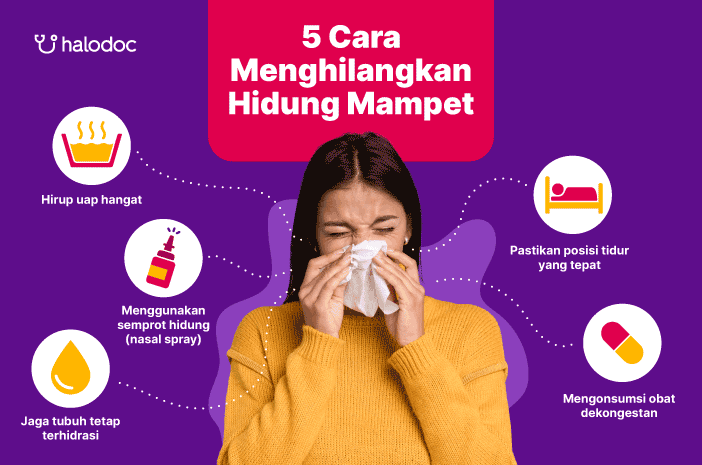 Ada beberapa cara efektif untuk menghilangkan hidung mampet, seperti menghirup uap hangat, menggunakan semprotan hidung saline, menjaga tubuh tetap terhidrasi, mengatur posisi tidur, dan mengonsumsi dekongestan.