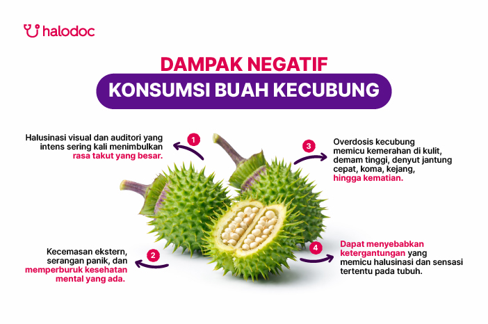 Meski tergolong buah-buahan, kecubung memiliki dampak negatif yang serius bagi tubuh. Bahkan, beberapa orang menyalahgunakan buah ini sebagai zat adiktif. Sebab, buah kecubung dapat menginduksi halusinasi dan euforia.