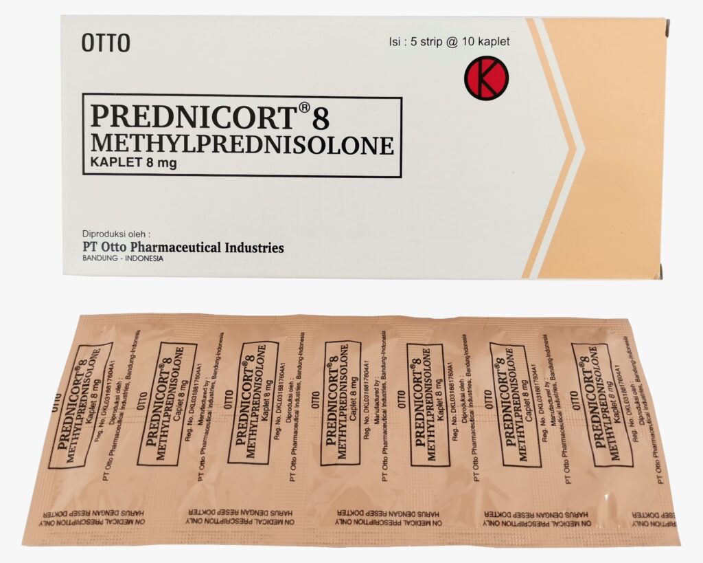Prednicort 8 mg 10 Tablet adalah obat radang tenggorokan dewasa yang mengandung methylprednisolone, salah satu kortikosteroid yang bekerja kuat dalam menekan peradangan dan memiliki efek untuk mengurangi reaksi alergi, seperti pada rhinitis alergi dan dermatitis alergi.