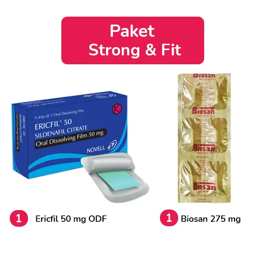 Paket ini merupakan perpaduan dua produk seperti Ericfil 50 mg ODF dan Biosan 275 mg 6 Tablet.