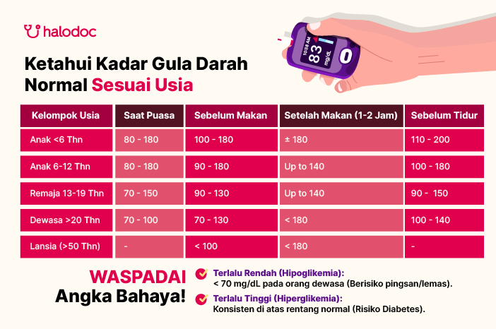 Itulah kadar gula darah normal berdasarkan usia yang perlu kamu ketahui. Bila kamu mengidap diabetes, cari juga obat dan suplemen lainnya di Toko Kesehatan Halodoc.