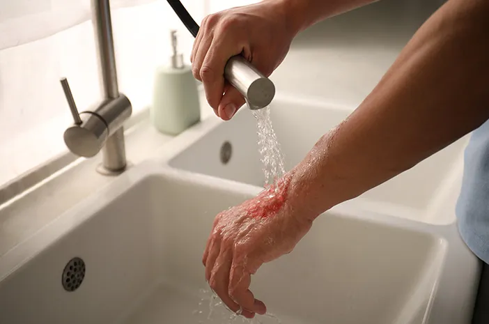 - Dinginkan luka dengan air mengalir selama 10-20 menit. Hindari penggunaan air es karena dapat memperparah kerusakan jaringan.