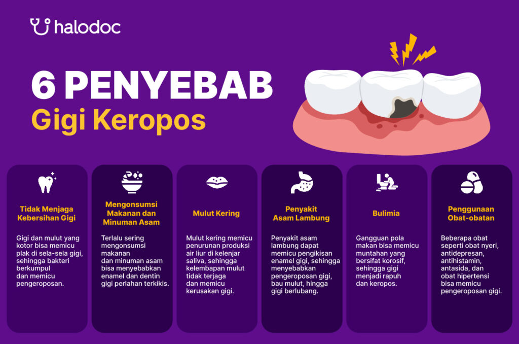 Gigi keropos bisa disebabkan oleh paparan zat asam. Masalah ini juga dapat dipicu oleh penyakit asam lambung, mulut kering atau penggunaan obat antihistamin. Kondisi tersebut dapat membuat lapisan enamel jadi terkikis.
