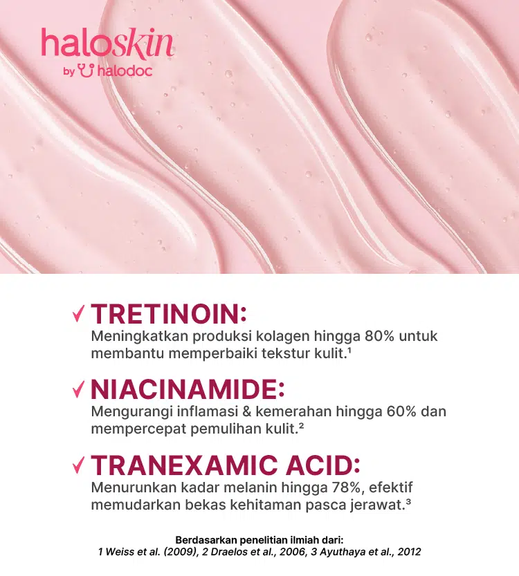 - Tretinoin: Bahan aktif ini merangsang produksi kolagen, yang sangat penting untuk memperbaiki tekstur kulit dan menjadikannya lebih halus.