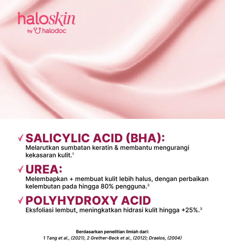 - Urea: Berfungsi melemahkan dan melonggarkan sumbatan keratin yang mengeras, membantu mengangkat sel kulit mati.
