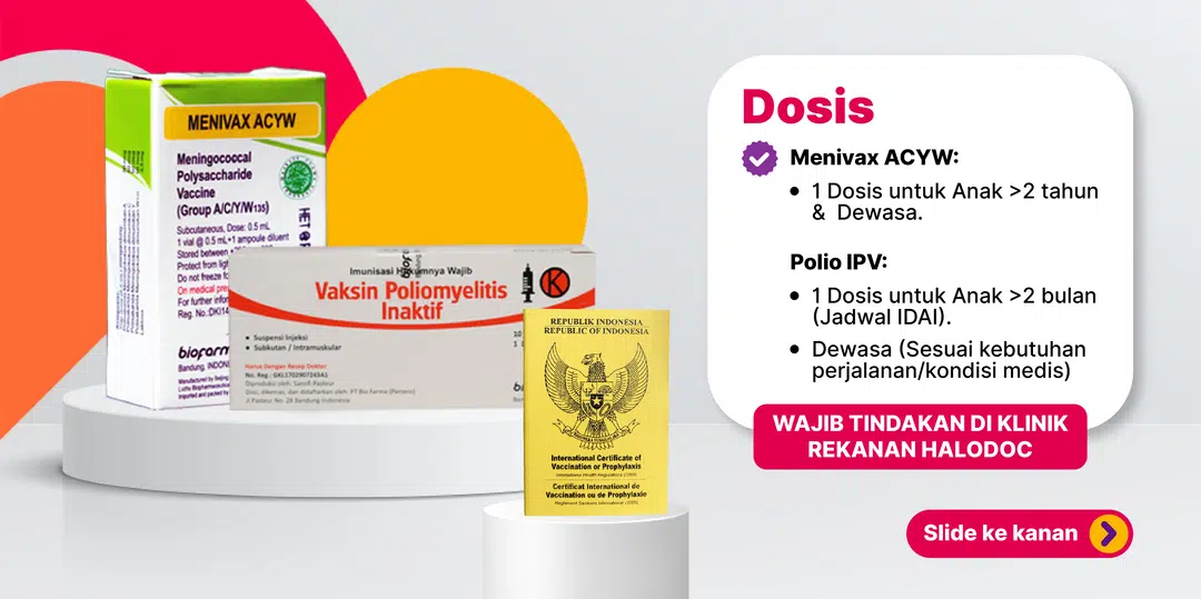 Penting: Untuk kebutuhan Vaksin Meningitis dan Polio dengan Sertifikat Vaksinasi Internasional (eICV/Buku Kuning), vaksinasi dilakukan di Klinik Halomedika (buka Senin–Jumat & Minggu 08:00–15.00 WIB; Sabtu 08:00-18:00 WIB).
