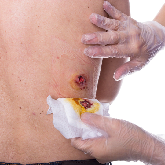 - Pemeriksaan fisik, Pengukuran luka, Pemberian obat nyeri untuk debridement mekanis dan Pemberian anestesi lokal atau umum untuk debridement pembedahan
