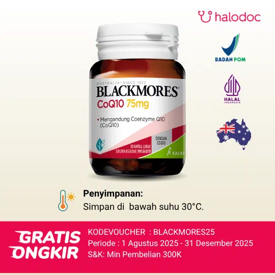 BLACKMORES COQ10 75 MG adalah suplemen kesehatan yang mengandung Coenzyme Q10 (CoQ10), suatu antioksidan yang dibutuhkan untuk produksi energi seluler.