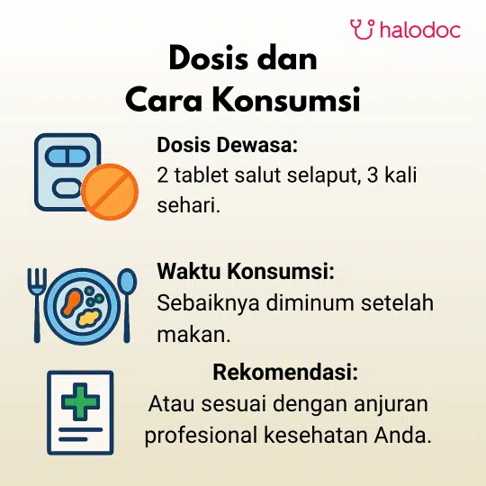 - Dewasa: 2 tablet 3x sehari, atau sesuai petunjuk dokter.