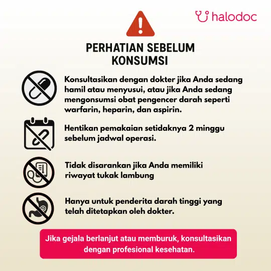 Hanya untuk penderita darah tinggi yang telah ditetapkan oleh dokter. Selama penggunaan, konsultasi pada dokter secara berkala. Hentikan penggunaan 1-2 minggu sebelum menjalani prosedur operasi (termasuk pencabutan gigi) untuk meminimalkan risiko perdarahan. Gunakan sesuai dosis yang dianjurkan.