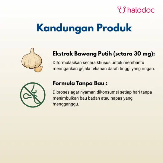 Produk ini mengandung ekstrak Bawang Putih (Allium sativum) yang memiliki senyawa sulfur aktif. Senyawa ini secara tradisional digunakan untuk membantu mendukung sirkulasi darah dan menjaga tekanan darah yang sehat (sudah dalam batas normal). Proses odourless meminimalkan bau khas bawang putih.