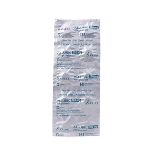ALLURIC 100 MG TABLET adalah obat yang digunakan untuk menurunkan kadar asam urat dalam darah. Obat ini megandung zat aktif Allopurinol yang bekerja dengan cara menghambat enzim xanthine oksidase, sehingga menghambat pembentukan asam urat dan juga dapat menghambat sintesis purin. Enzim xanthine oksidase adalah enzim yang bertanggung jawab untuk oksidasi suatu zat alami dalam tubuh bernama hypoxanthine untuk menjadi xanthine, dan kemudian menjadi asam urat. Obat ini digunakan untuk pencegahan serangan gout kronis, mengobati sindrom lisis tumor dalam kemoterapi yang menyebabkan terjadinya hyperuricemia akut berat, mengobati batu ginjal dengan komponen asam urat dan kalsium oksalat (nefrolitiasis asam urat). Dalam penggunaan obat ini harus SESUAI DENGAN PETUNJUK DOKTER.