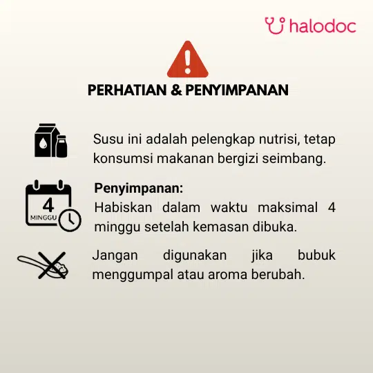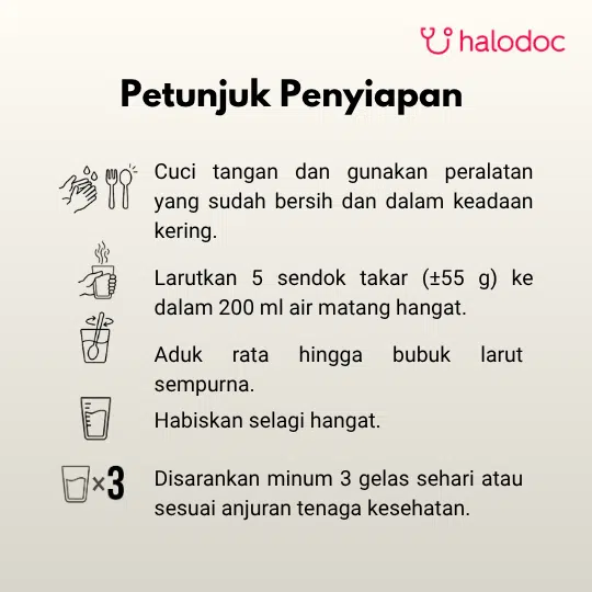 larutkan 40g-50g (3 - 4 sendok) ke dalam 300 ml air hangat. Diminum 1 jam sesudah makan