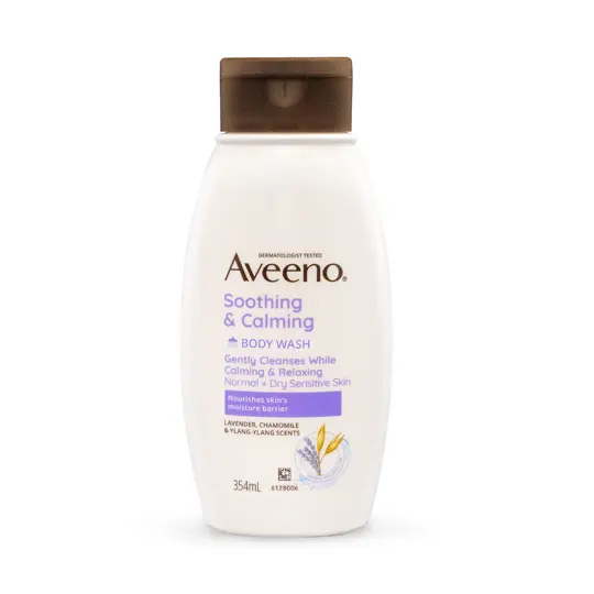 Aveeno Soothing & Calming Body Wash 354ml - Sabun Mandi Melembapkan 354ml. Aveeno Soothing & Calming Body Wash merupakan sabun mandi dengan Natural Colloidal Oat, kaya akan emmolient, membantu mengunci kelembapan kulit kering & kulit sensitif. Dermatologist tested. Formula Natural Colloidal Oat, kaya akan emmolient, bantu mengunci kelembapan kulit dengan keharuman Lavender, Chamomile dan Ylang-Ylang yang dikenal membantu menenangkan dan memberikan kenyamanan. Teruji klinis lembut digunakan untuk kulit sensitif. Tanpa tambahan sabun, hypoallergenic dan dermatologist tested. Diformulasikan dengan 95% bahan biodegradable.