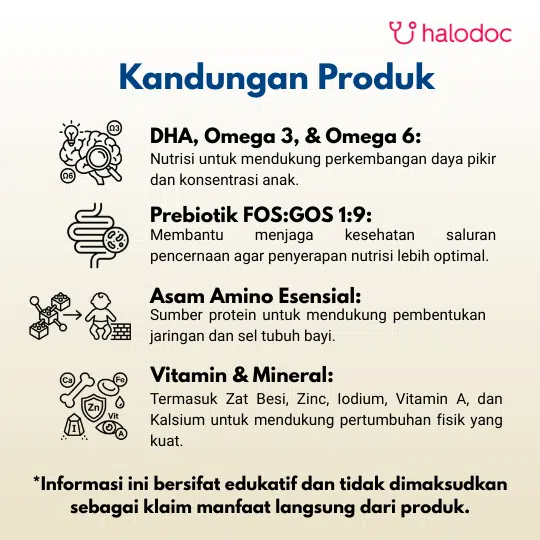 Laktosa, Protein Whey, Minyak Nabati (mengandung lesitin kedelai, antioksidan askorbil palmitat, dan campuran tokoferol), Susu Skim Bubuk, Galakto Oligo Sakarida (GOS), 7 Mineral, Frukto Oligo Sakarida (FOS), 14 Vitamin, Minyak sel tunggal (AA) (mengandung antioksidan askorbil palmitat, natrium askorbat dan tokoferol), Minyak Ikan (DHA) (Mengandung antioksidan sodium askorbat, tokoferol, dan askorbil palmitat), L-karnitin