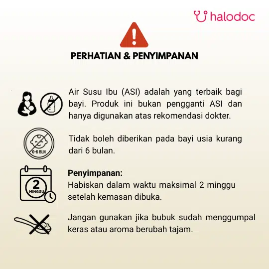 Air Susu Ibu (ASI) adalah yang terbaik untuk bayi Anda. Susu formula bayi bukan pengganti Air Susu Ibu (ASI). Penggunaan susu formula hanya dapat dilakukan sesuai saran dan petunjuk dokter dan ahli kesehatan lainnya. Pemberian Air Susu Ibu (ASI) secara eksklusif bagi bayi di Indonesia sejak lahir sampai dengan bayi berumur 6 (enam) bulan dan dianjurkan dilanjutkan sampai anak usia 2 (dua) tahun dengan pemberian makanan pendamping ASI. Untuk kesehatan bayi Anda, ikutilah tabel aturan pemberian dengan baik atau konsultasikan dengan dokter anak Anda atau ahli kesehatan lainnya, mengenai kebutuhan serta cara yang tepat atas penggunaan susu formula. PETUNJUK PENYIMPANAN : Tutuplah rapat-rapat kemasan sesudah dipakai dan simpan di tempat yang sejuk dan kering, tetapi bukan di lemari es. Hindari sinar matahari. Pakailah isi kemasan ini dalam 2 minggu sesudah dibuka. Jangan konsumsi Jika Anda menemukan perubahan warna, bau, dan rasa pada produk ini.