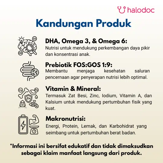 Laktosa, Whey Protein, Minyak Nabati, Susu Skim Bubuk, Galakto Oligo Sakarida (GOS), 7 Mineral, Frukto Oligo Sakarida (FOS), 14 Vitamin, Minyak Ikan (DHA) (Mengandung antioksidan tokoferol, sodium askorbat dan askorbil palmitat), Minyak sel tunggal (AA) (Mengandung antioksidan tokoferol, sodium askorbat dan askorbil palmitat), L-karnitin.