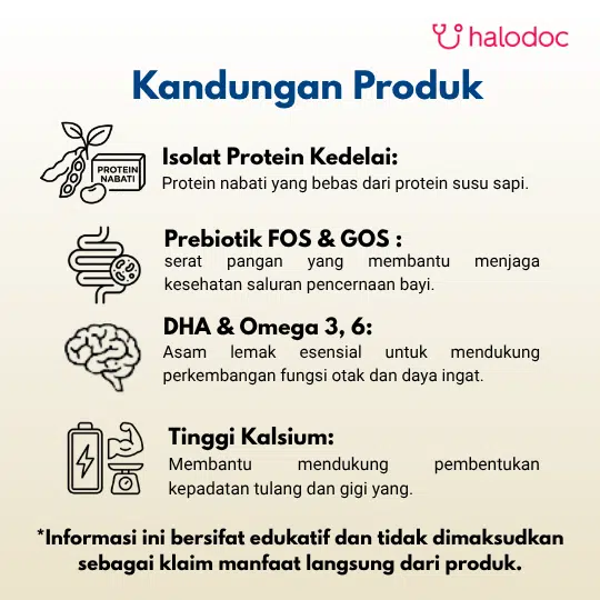 Maltodekstrin, Minyak Nabati (Mengandung Antioksidan Askorbil Palmitat dan Tokoferol), Isolat Protein Kedelai (18.59%), Serat Pangan, 9 Mineral & Premiks Mineral, L- Metionin, 3 Vitamin (Natrium Askorbat, Beta Karoten, Vitamin B12) dan Premiks Vitamin, Minyak Sel Tunggal (Sumber AA, Mengandung Antioksidan Tokoferol & Natrium Askorbat), Minyak Ikan (Sumber DHA, Mengandung Antioksidan Tokoferol dan Natrium Askorbat), Kolin Klorida, Taurin, L-Karnitin.