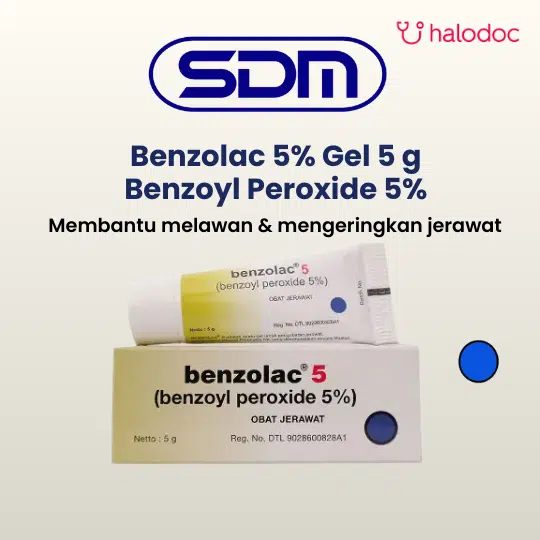 Benzolac 5% Gel 5 g mengandung zat aktif Benzoyl Peroxide. Benzoyl Peroxide digunakan untuk mengatasi acne vulgaris ringan hingga sedang.