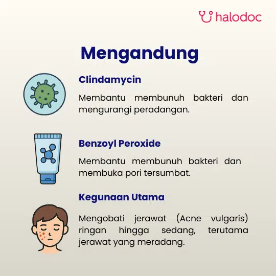 Tiap gram gel mengandung: Benzoyl Peroxide 5% (50 mg), Clindamycin Phosphate 1.2% (12 mg).