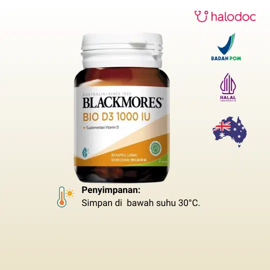Produk ini mengandung vitamin D3 (cholecalciferol) 1000 mg, yaitu bentuk vitamin D yang sama dengan yang secara alami diproduksi oleh tubuh saat terpapar sinar matahari. Vitamin D sendiri memiliki peran penting dalam berbagai fungsi tubuh. Beberapa faktor, seperti paparan sinar matahari yang terbatas, usia lanjut, atau kondisi kulit tertentu, dapat memengaruhi kadar vitamin D dalam tubuh, sehingga suplementasi mungkin diperlukan. Untuk penggunaannya, Blackmores Bio D3 1000 IU 30 Kapsul umumnya diberikan diberikan 1 kali sehari atau sesuai dosis yang dianjurkan. Penting untuk diingat bahwa produk ini adalah suplemen kesehatan dan tidak dimaksudkan sebagai pengganti pola makan seimbang atau gaya hidup sehat.