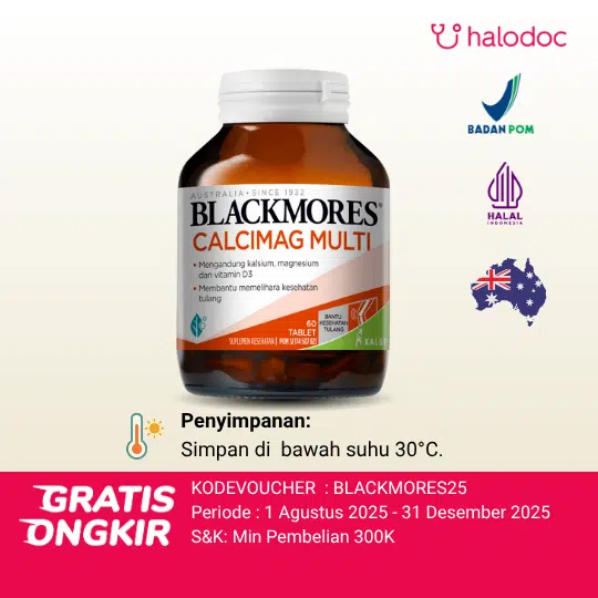 Blackmores Calcimag Multi 30 Tablet adalah suplemen kesehatan yang diformulasikan untuk mendukung kesehatan tulang dan otot. Produk ini mengandung kombinasi mineral Kalsium dan Magnesium serta Vitamin D3 dan Vitamin K1. Informasi Umum Terkait Kandungan: *Informasi ini bersifat edukatif dan tidak dimaksudkan sebagai klaim manfaat langsung dari produk. Kalsium dan Magnesium adalah mineral utama yang dibutuhkan untuk kepadatan tulang dan fungsi otot. Vitamin D3 berperan penting membantu penyerapan Kalsium di usus. Vitamin K1 ditambahkan untuk membantu mengarahkan Kalsium yang diserap agar dimanfaatkan secara optimal oleh tulang.