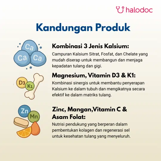 Kalsium sitrat 300 mg (Kalsium 63.2 mg), Kalsium fosfat 325 mg (Kalsium 126 mg), Asam amino kalsium chelate (Kalsium 40 mg), Kalsium total 229.2 mg, Magnesium fosfat 65 mg (Magnesium 13.4 mg), Magnesium oxide-heavy (Magnesium 102.5 mg), Magnesium total 115.9 mg, Asam amino zinc chelate (Zinc 2.5 mg) 12.5 mg, Asam amino mangan chelate (Mangan 1.5 mg) 15 mg, Asam askorbat (Vit C) 60 mg, Cholecalciferol (Vit D3 200 IU) 5 mcg, Phytomenadione (Vit K1) 5 mcg, Asam folat 100 mcg