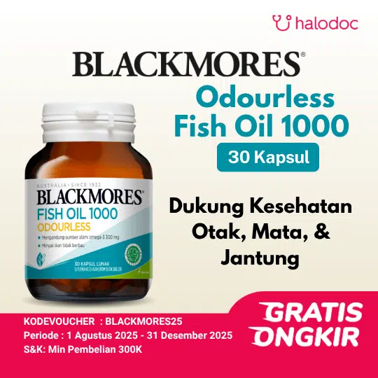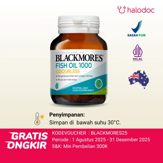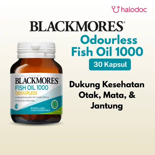 Blackmores Odourless Fish Oil 1000 30 Kapsul adalah suplemen kesehatan yang mengandung minyak ikan (sumber Omega-3: EPA dan DHA) untuk membantu memelihara kesehatan.