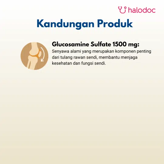Produk ini mengandung Glucosamine Sulfate 1500 mg, zat yang secara alami ada dalam tubuh sebagai komponen utama tulang rawan (kartilago) dan cairan sendi. Suplementasi Glucosamine bertujuan untuk menyediakan bahan baku yang dibutuhkan tubuh untuk membantu menjaga kesehatan dan fungsi sendi.