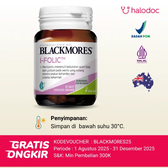 BLACKMORES I-FOLIC merupakan suplemen dengan kombinasi yodium dan asam folat, untuk memenuhi kebutuhan asam folat dan yodium selama kehamilan. Asam folat berperan untuk memelihara pertumbuhan dan perkembangan janin. Asupan asam folat yang cukup apabila disertai dengan diet gizi seimbang dapat mengurangi resiko neural tube defect pada janin. Yodium berperan penting untuk menyeimbangkan kadar hormon tiroid.