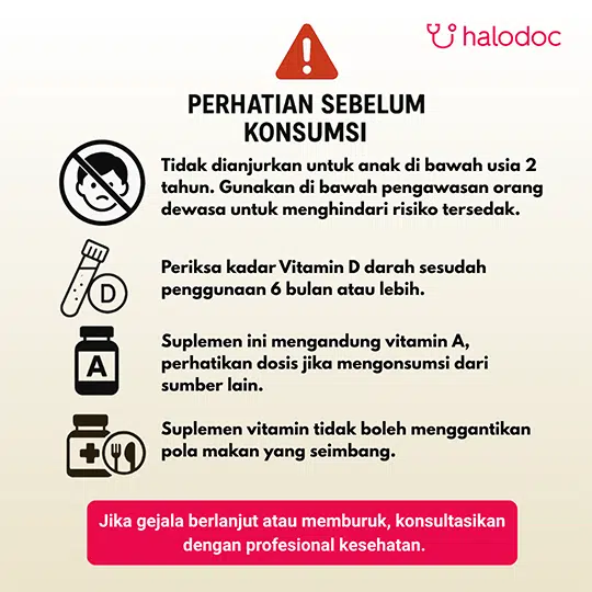 Tidak dianjurkan untuk dikonsumsi anak dibawah usia 2 tahun. Dianjurkan untuk melakukan konsultasi kepada dokter jika anak sedang mengonsumsi suplemen vitamin A atau D lainnya. Vitamin A, D, dan E adalah vitamin yang larut lemak dan dapat menumpuk di tubuh. Gunakan sesuai dosis yang dianjurkan.