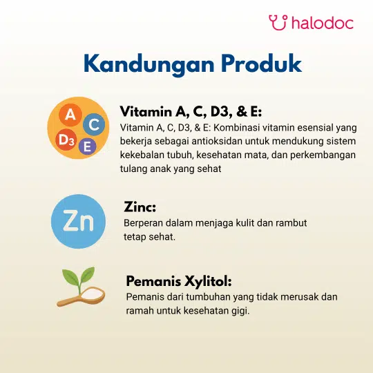 Membantu memelihara daya tahan tubuh anak. Penggunaannya ditujukan untuk memenuhi kebutuhan vitamin dan mineral esensial (A, C, D3, E, Zinc) guna mendukung fungsi sistem kekebalan tubuh, kesehatan tulang, dan penglihatan.
