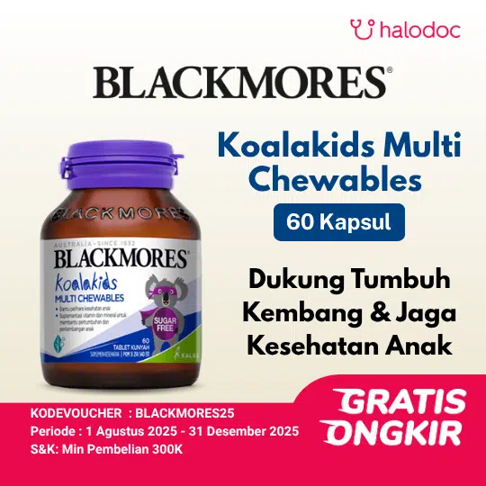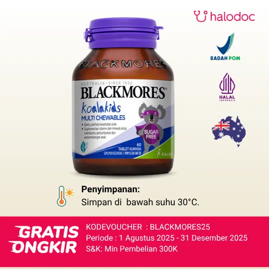BLACKMORES KOALAKIDS MULTI CHEWABLES adalah suplemen multivitamin anak yang mengandung 12 vitamin & 6 mineral. Produk ini diformulasikan khusus dalam bentuk tablet kunyah untuk mendukung eksplorasi belajar si Kecil. Informasi Umum Terkait Kandungan*: *Informasi ini bersifat edukatif dan tidak dimaksudkan sebagai klaim manfaat langsung dari produk. Suplemen ini mengandung vitamin esensial seperti Vitamin A, B Kompleks, C, D, dan E, serta mineral penting seperti Kalsium, Zat Besi, Yodium, Magnesium, dan Zinc yang secara kolektif berperan untuk membantu mendukung pertumbuhan, perkembangan, dan kesehatan umum pada anak-anak.