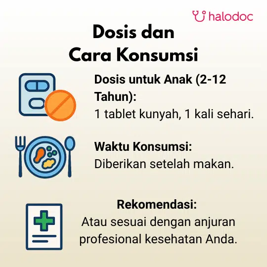 2 - 7 tahun: 1 tablet sehari 8 - 12 tahun: 2 tablet sehari