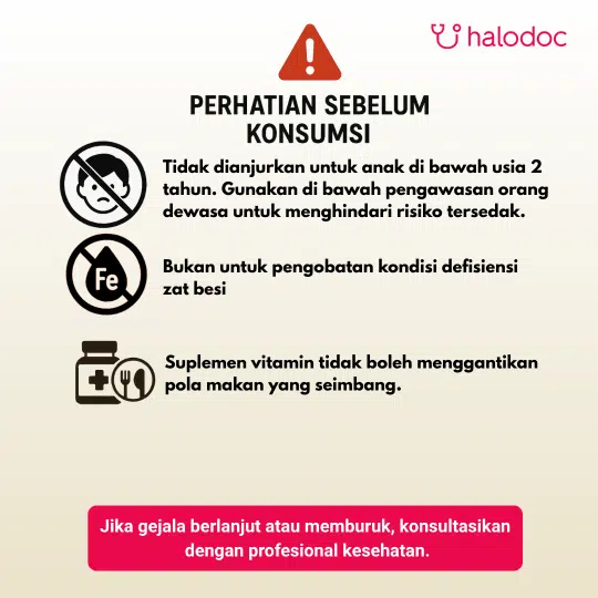 Tidak dianjurkan untuk anak di bawah 2 tahun. Pengawasan orang tua diperlukan saat anak mengonsumsi produk ini untuk memastikan tablet dikunyah dengan baik. Suplemen tidak dapat menggantikan nutrisi dari makanan yang seimbang.