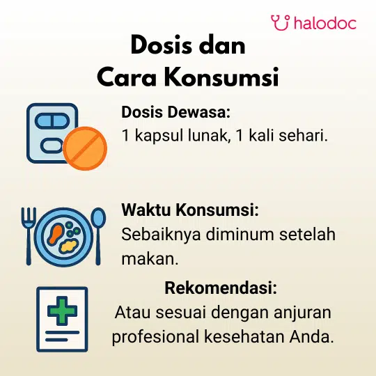 Dewasa : 1-2 kapsul sehari setelah makan, atau sesuai petunjuk dokter.