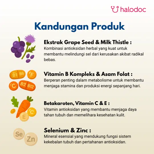 Produk ini mengandung kombinasi antioksidan kuat seperti Vitamin A (Beta-Carotene), Vitamin C, Vitamin E, Selenium, Zinc dan beberapa herbal. Nutrisi-nutrisi ini bekerja bersama-sama untuk membantu menetralisir radikal bebas yang dapat merusak sel, serta mendukung fungsi normal sistem kekebalan tubuh.