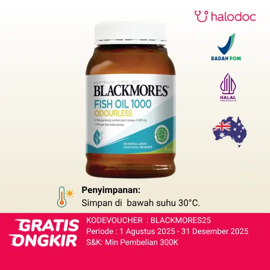 Blackmores Odourless Fish Oil 1000 180 Kapsul adalah suplemen kesehatan yang mengandung minyak ikan (sumber Omega-3: EPA dan DHA) untuk membantu memelihara kesehatan. Informasi Umum Terkait Kandungan*: Informasi ini bersifat edukatif dan tidak dimaksudkan sebagai klaim manfaat langsung dari produk. Produk ini mengandung asam lemak Omega-3 (EPA dan DHA), suatu nutrisi esensial yang dikenal perannya dalam struktur membran sel dan fungsi tubuh. Omega-3 berperan penting dalam memelihara kesehatan jantung, mendukung fungsi otak, dan penglihatan. Produk ini juga diformulasikan secara khusus agar tidak berbau amis (odourless) saat dikonsumsi.