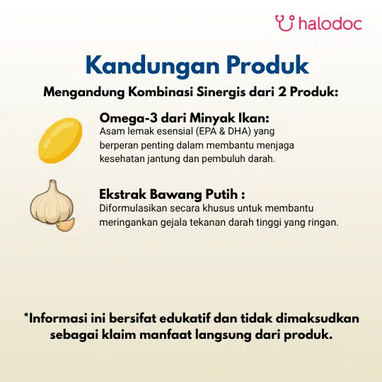 Minyak ikan (omega-3) membantu menjaga kesehatan pembuluh darah dan fungsi jantung. Bawang putih secara tradisional digunakan untuk mendukung sirkulasi dan membantu menjaga tekanan darah yang sehat. Kedua komponen ini bekerja sinergis untuk mendukung sistem kardiovaskular.