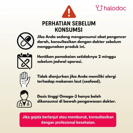 Tidak untuk digunakan pada individu dengan riwayat alergi terhadap ikan atau produk turunan ikan. Konsultasikan dengan dokter jika Anda memiliki gangguan pembekuan darah atau akan menjalani operasi.