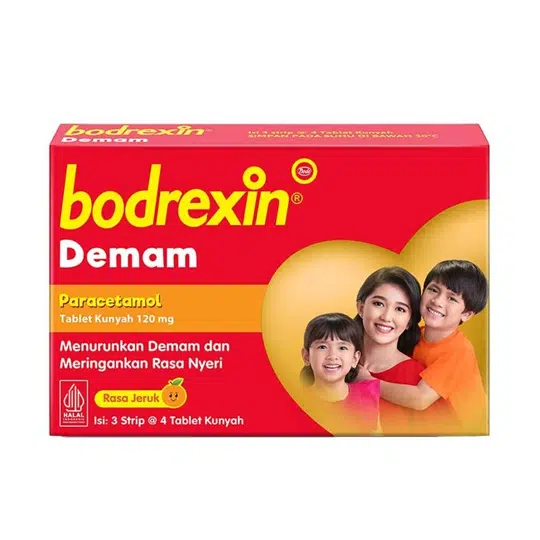 Bodrexin Demam 120 mg 12 Tablet Kunyah adalah obat penurun panas dan pereda nyeri untuk anak-anak dalam bentuk tablet kunyah dengan rasa jeruk. Obat ini memiliki kandungan paracetamol.