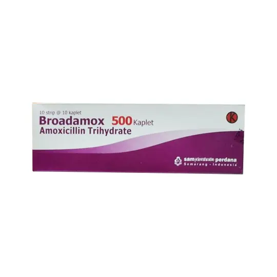 Broadamox adalah obat antibiotik yang mengandung Amoxicillin. Amoksisilin adalah aminopenisilin semisintetik yang menghambat langkah transpeptidasi akhir sintesis peptidoglikan di dinding sel bakteri dengan mengikat 1 atau lebih protein pengikat penisilin (PBP), sehingga menghambat biosintesis dinding sel dan akhirnya menyebabkan lisis bakteri. Obat ini digunakan untuk infeksi yang disebabkan oleh strain-strain bakteri yang peka spt Staphylococcus bukan penghasil penisilinase, Streptococcus, E.Coli, H.Influenzae, Streptococcus Pneumoniae, Streptococcus Faecalis, P.mirabilia dan N.Gonorrheae (bukan penghasil penisilinase) pada penyakit infeksi kulit dan jaringan lunak, infeksi saluran pernafasan, infeksi saluran genitourinari, dan gonore. Dalam penggunaan obat ini harus SESUAI DENGAN PETUNJUK DOKTER. Pembelian obat ini memerlukan edukasi terkait penggunaan atau pengonsumsian obat yang tepat dan aman yang akan dikenakan biaya.