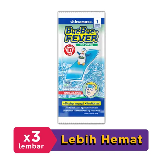 BYE BYE FEVER DEWASA merupakan plester yang digunakan pada dewasa untuk meringankan efek tidak nyaman karena demam, sakit gigi, sakit kepala. Plester ini memberikan efek dingin bekerja sampai 10 jam.